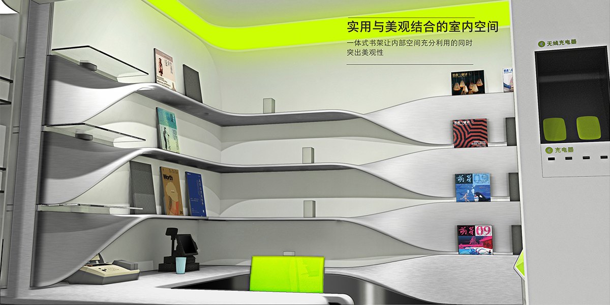 通過(guò)對(duì)中國(guó)郵政的文化背景研究,提出“以人為本”親民、便民的設(shè)計(jì)理念。其柔潤(rùn)的圓角和流暢的曲線(xiàn)為產(chǎn)品增添親和力,簡(jiǎn)潔的外觀與內(nèi)部流暢的曲線(xiàn)和燈光效果相呼應(yīng),凸顯產(chǎn)品的科技感同時(shí)又不顯得沉悶,多功能和模塊化設(shè)計(jì)更是人性化設(shè)計(jì)的主要體現(xiàn)。