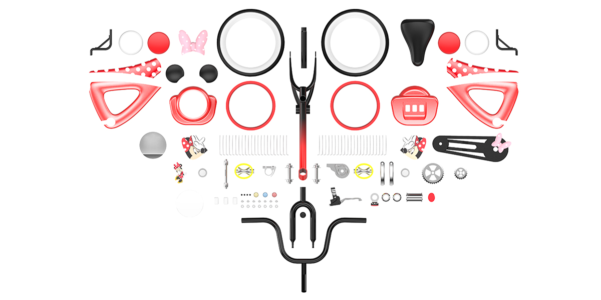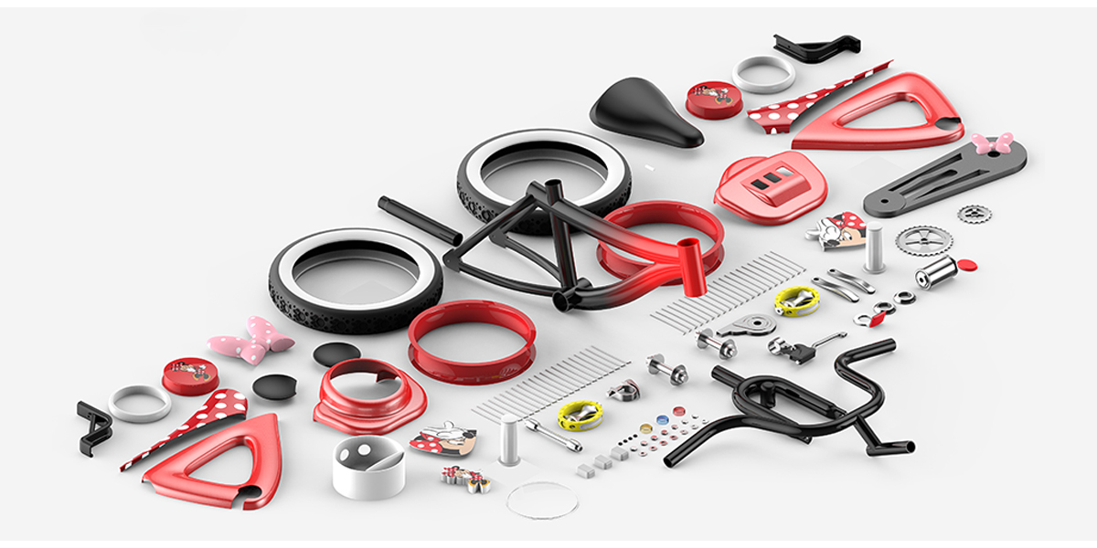 產(chǎn)品運用簡約的設(shè)計語言進行外觀設(shè)計,運用不同的表面處理工藝提升產(chǎn)品價值感和美觀性,提供多樣的配色以滿足用戶多樣的審美需求。改變過去在兒童自行車產(chǎn)品上對迪士尼IP形象元素過于簡單直接的運用,能夠有效地提高客戶的品牌形象和品牌價值。