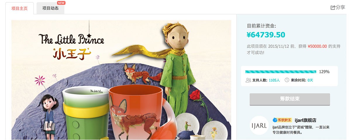 在小王子電影上映之際,木馬設計與天貓商家合作,推出小王子正版電影周邊產(chǎn)品。產(chǎn)品在淘寶眾籌平臺首次亮相,便受到消費者熱烈歡迎。此次合作是木馬繼梵高系列藝術衍生品之后在文化衍生品領域的又一成功嘗試,由木馬、淘寶平臺、天貓商家的協(xié)同合作創(chuàng)建了優(yōu)秀健康的商業(yè)模式,保證了閉環(huán)的、順暢的資源流通,成功將電影IP轉(zhuǎn)化為可交易的創(chuàng)意資本,實現(xiàn)其商業(yè)價值。