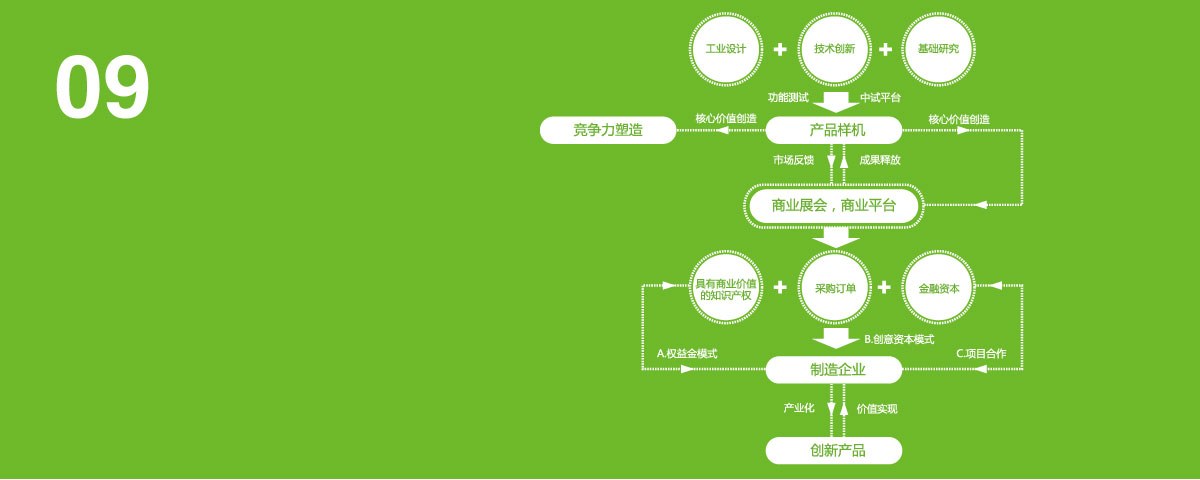 創(chuàng)意資本模式是創(chuàng)意設計價值實現(xiàn)的高級階段,將創(chuàng)意的力量作為一種資本形式驅(qū)動制造企業(yè) 的發(fā)展。從概念設計到產(chǎn)品樣機再到具有知識產(chǎn)權(quán)的創(chuàng)意資本,創(chuàng)意的價值得以真正實現(xiàn)。 基于特色產(chǎn)業(yè),建立區(qū)域工業(yè)設計研究院,不斷釋放效果。從概念設計,到產(chǎn)品樣機,再到具有知識產(chǎn)權(quán)的成果,幫助企業(yè)實現(xiàn)從制造力驅(qū)動到創(chuàng)新力驅(qū)動的轉(zhuǎn)變。搭建知識產(chǎn)權(quán)展示和交易平臺,更好的把產(chǎn)業(yè)需求和創(chuàng)意資源對接。建立知識產(chǎn)權(quán)保護平臺,保障創(chuàng)意資本模式的正常運行。