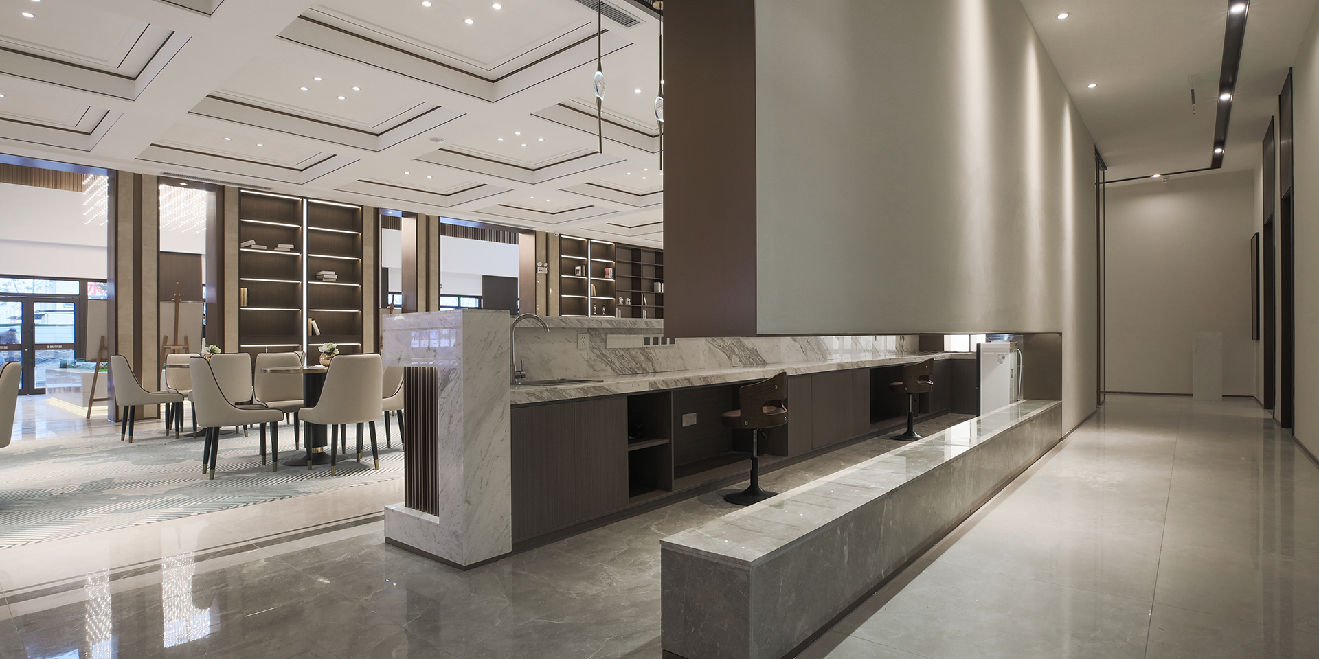 整體設(shè)計(jì)為凸顯明亮、簡潔、大氣,前臺顏色選用大理石材料,顏色偏向暖色調(diào),沙盤作為中心,大小規(guī)模適當(dāng),在燈光選了大型現(xiàn)代風(fēng)格燈具,共同塑造出年輕、有活力的品牌形象,符合其年輕人的購房者畫像。
